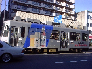 市電の線路とASAHIラッピングされた市電